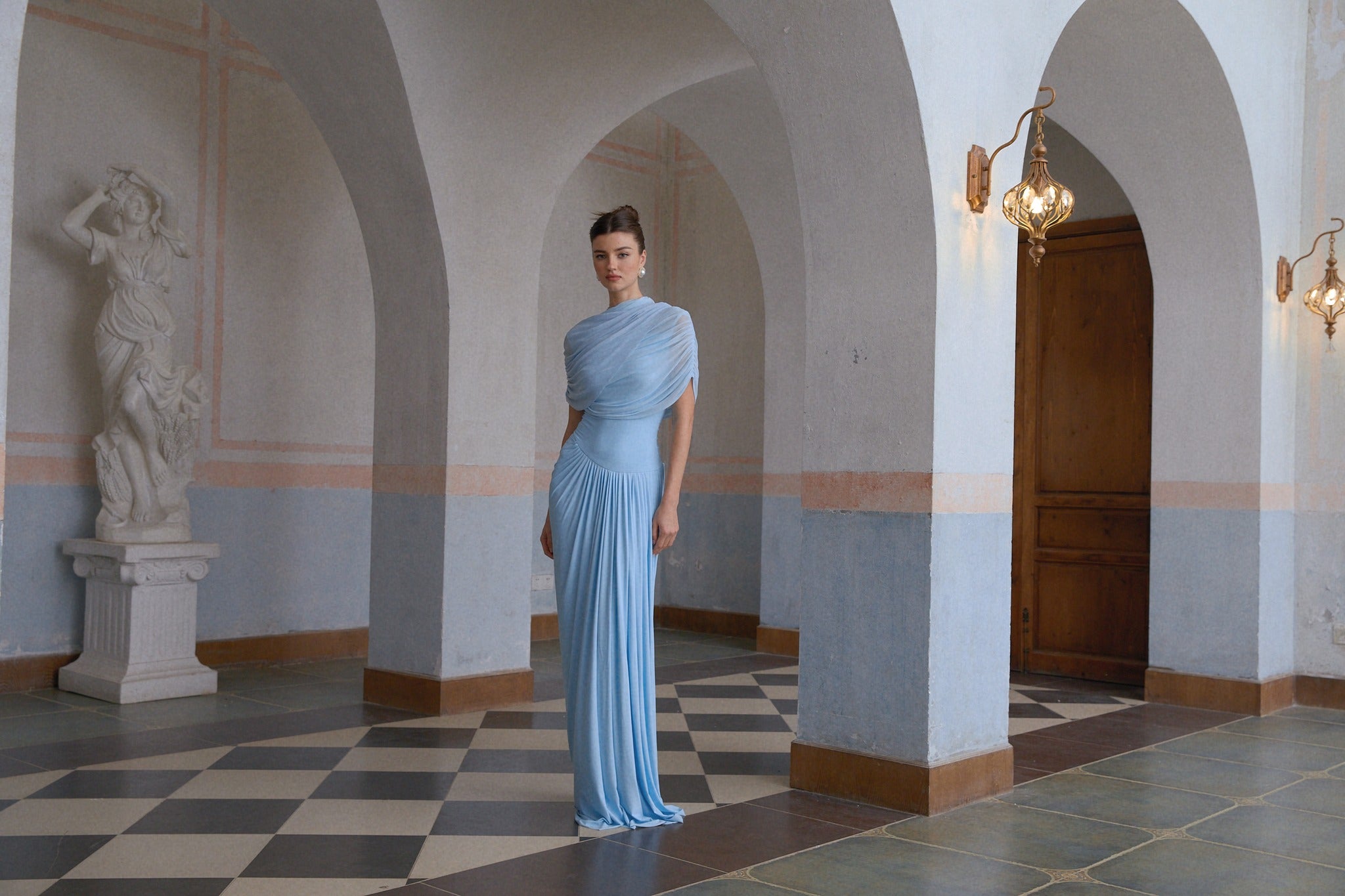 Catherine asymmetrical pleated maxi dress in Baby-blue