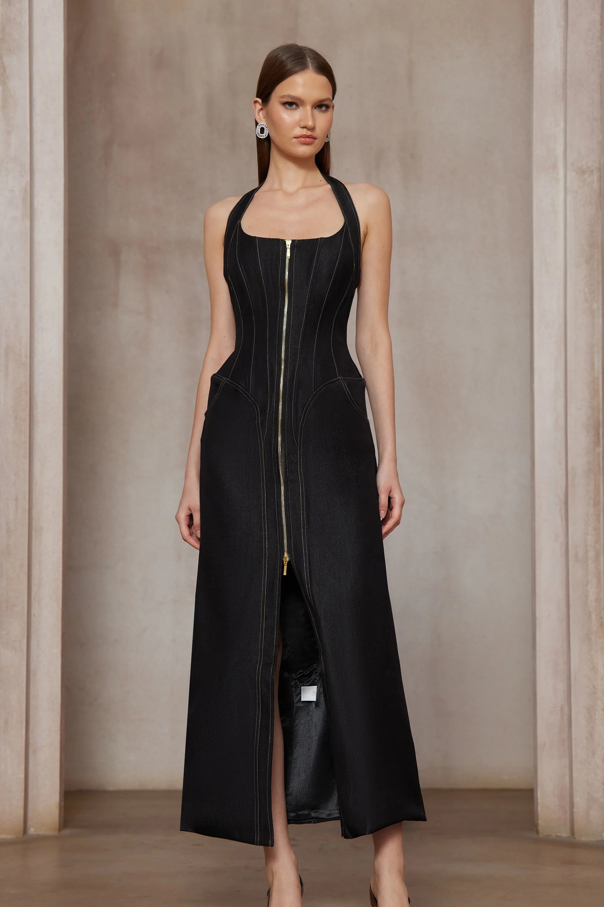 Adrienne black denim front-slit contrast-stitching maxi dress