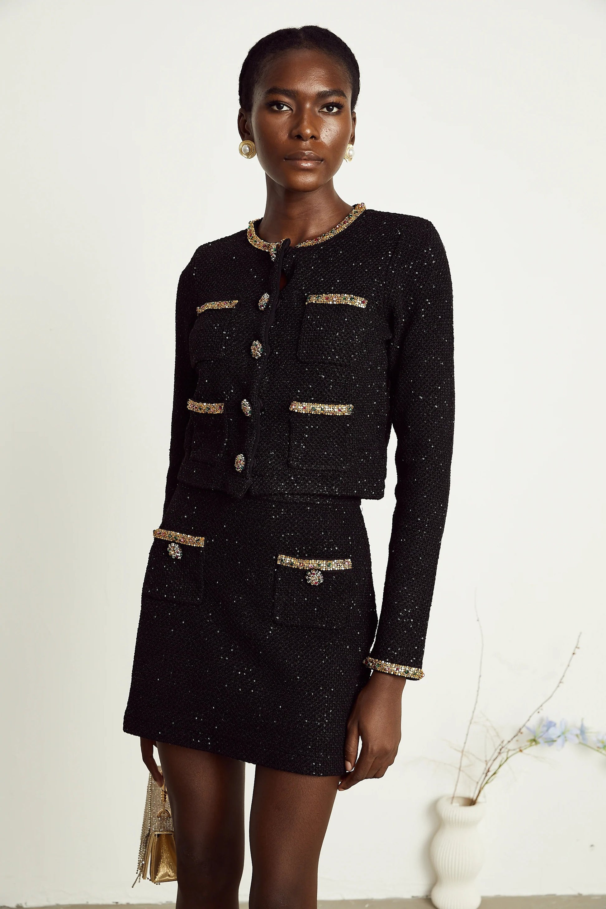 Ariane Black Sequined Tweed Jacket & Skirt Matching Set