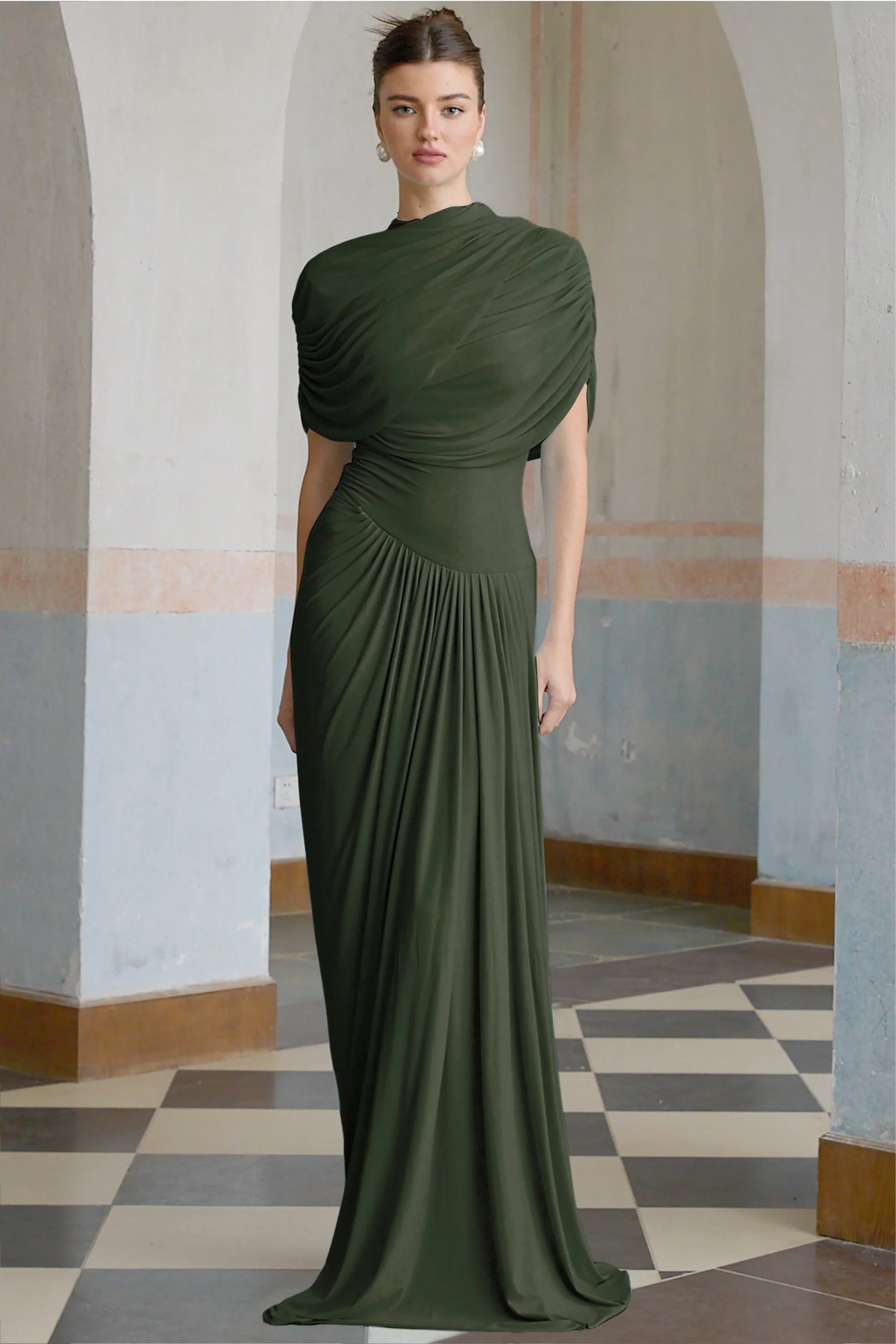 Catherine asymmetrical pleated maxi dress in Green