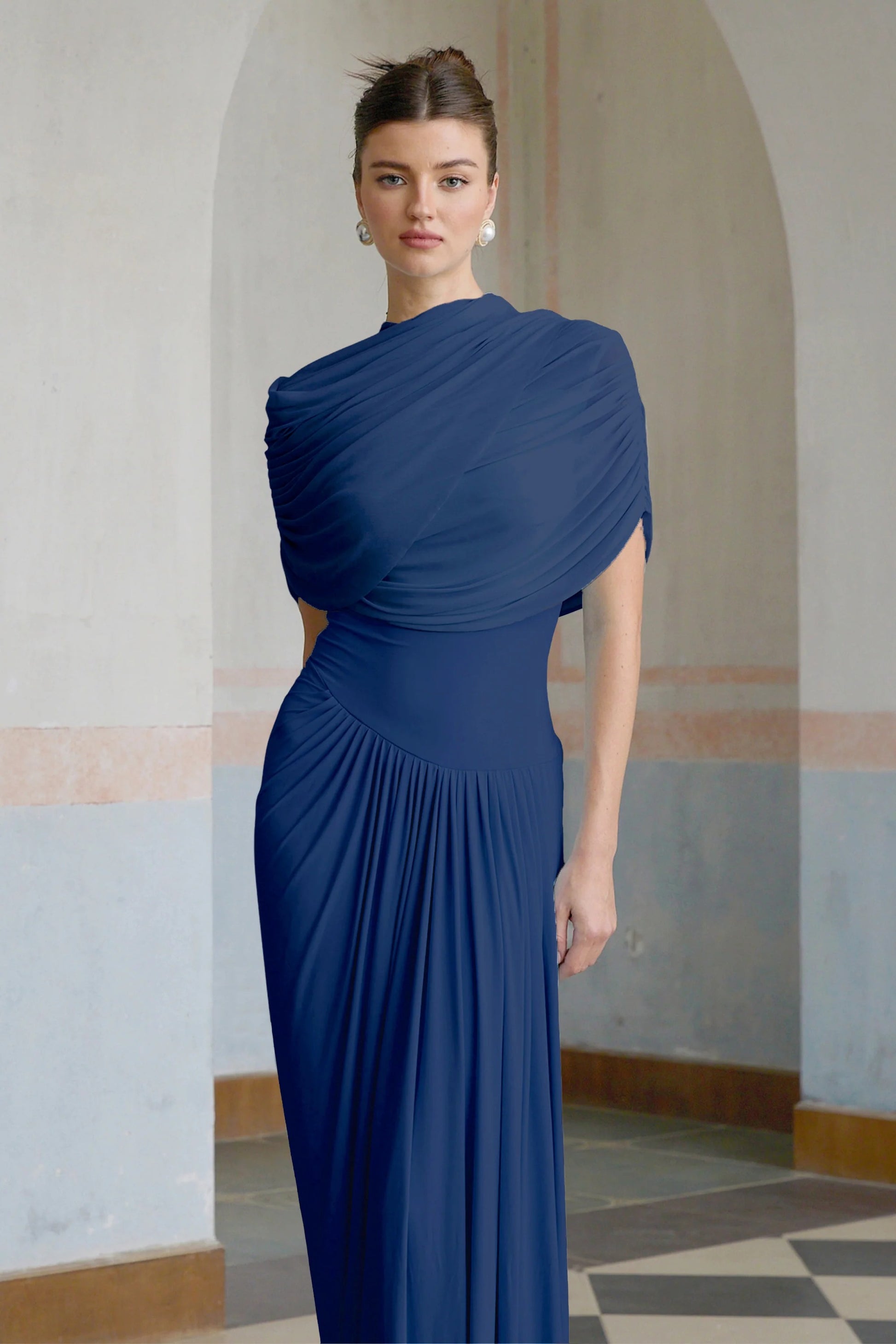 Catherine asymmetrical pleated maxi dress in Navy-blue