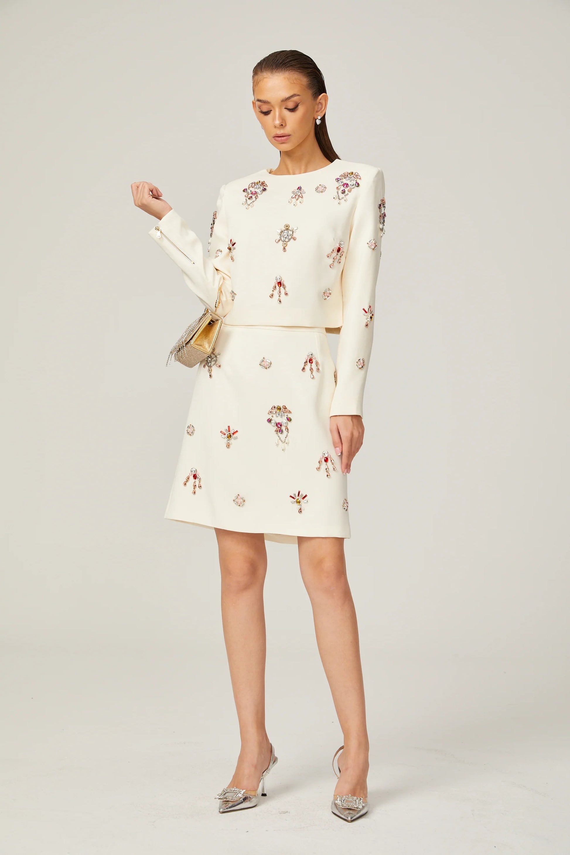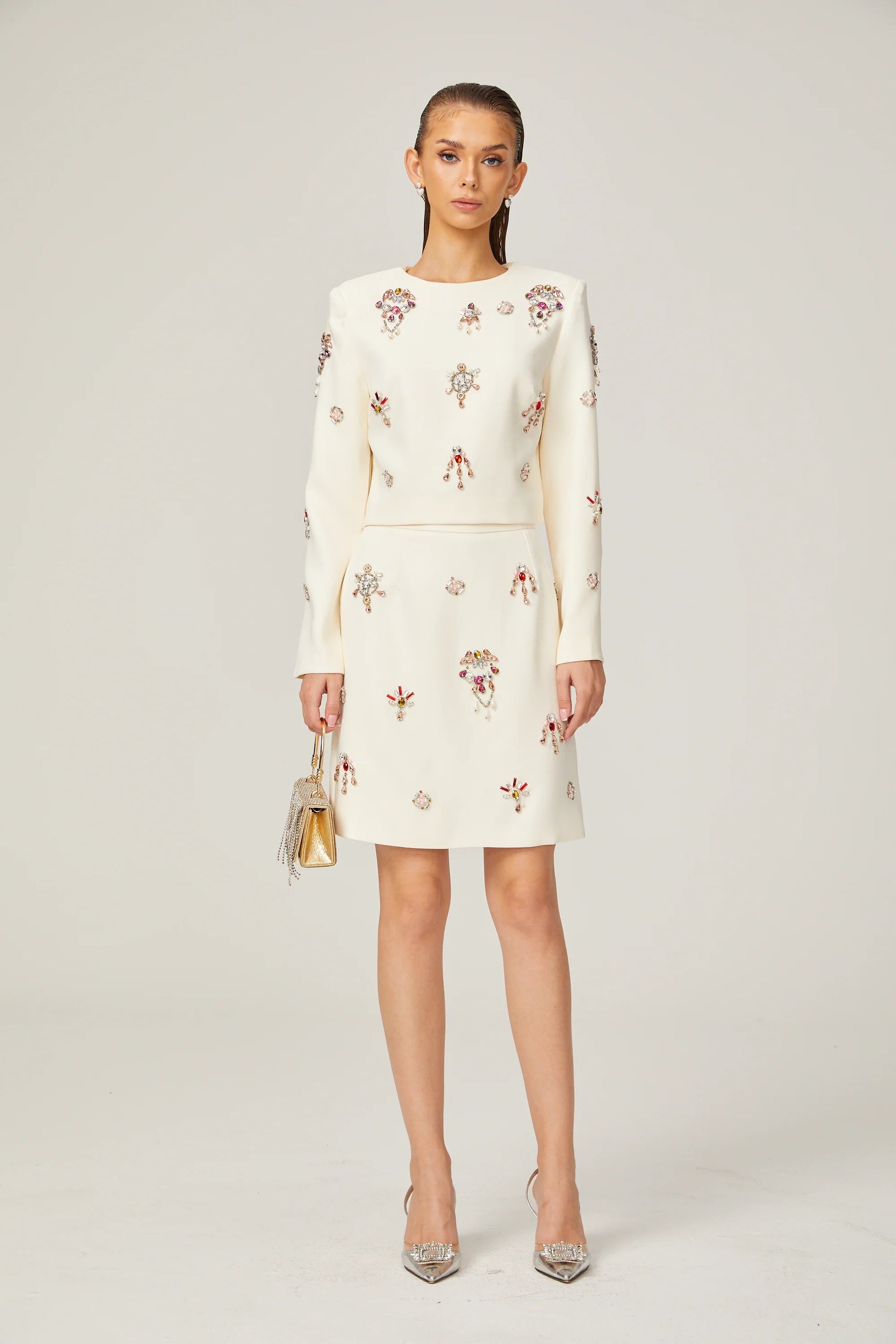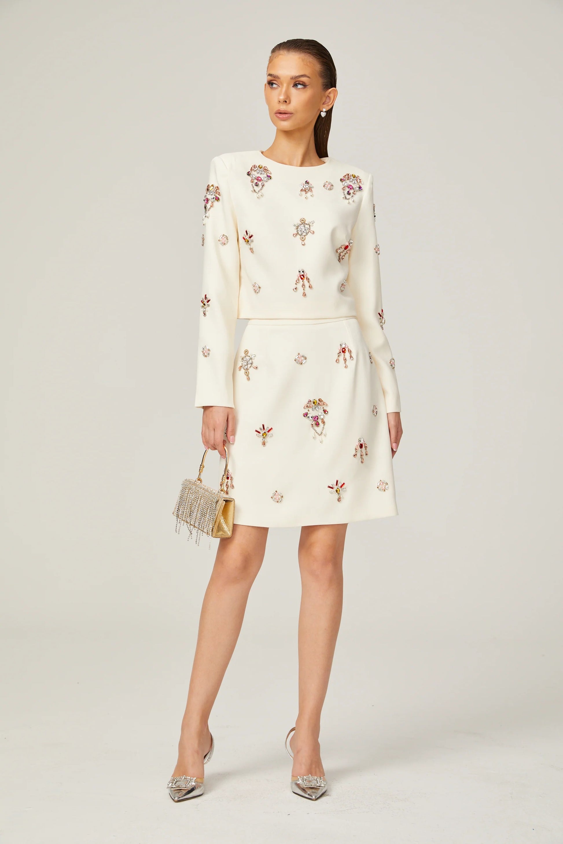 Jeanne white crystal-embellished top & skirt matching set