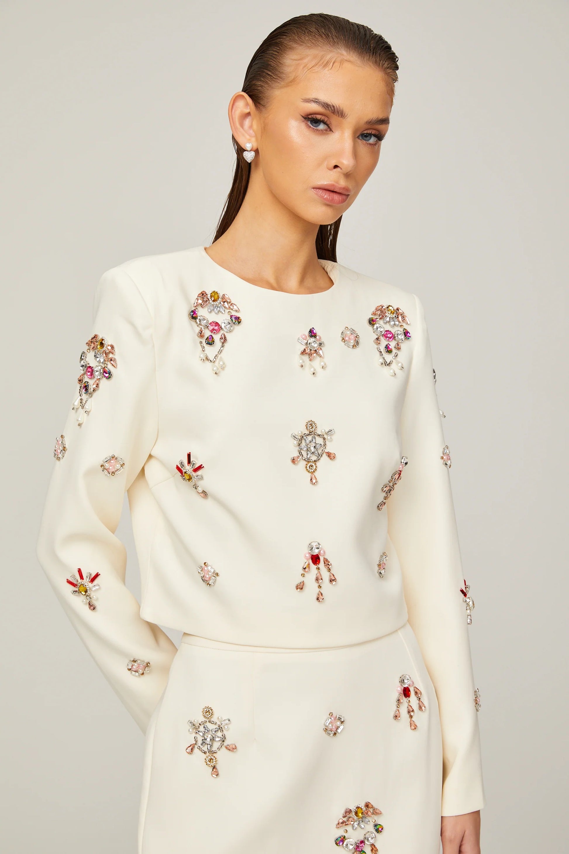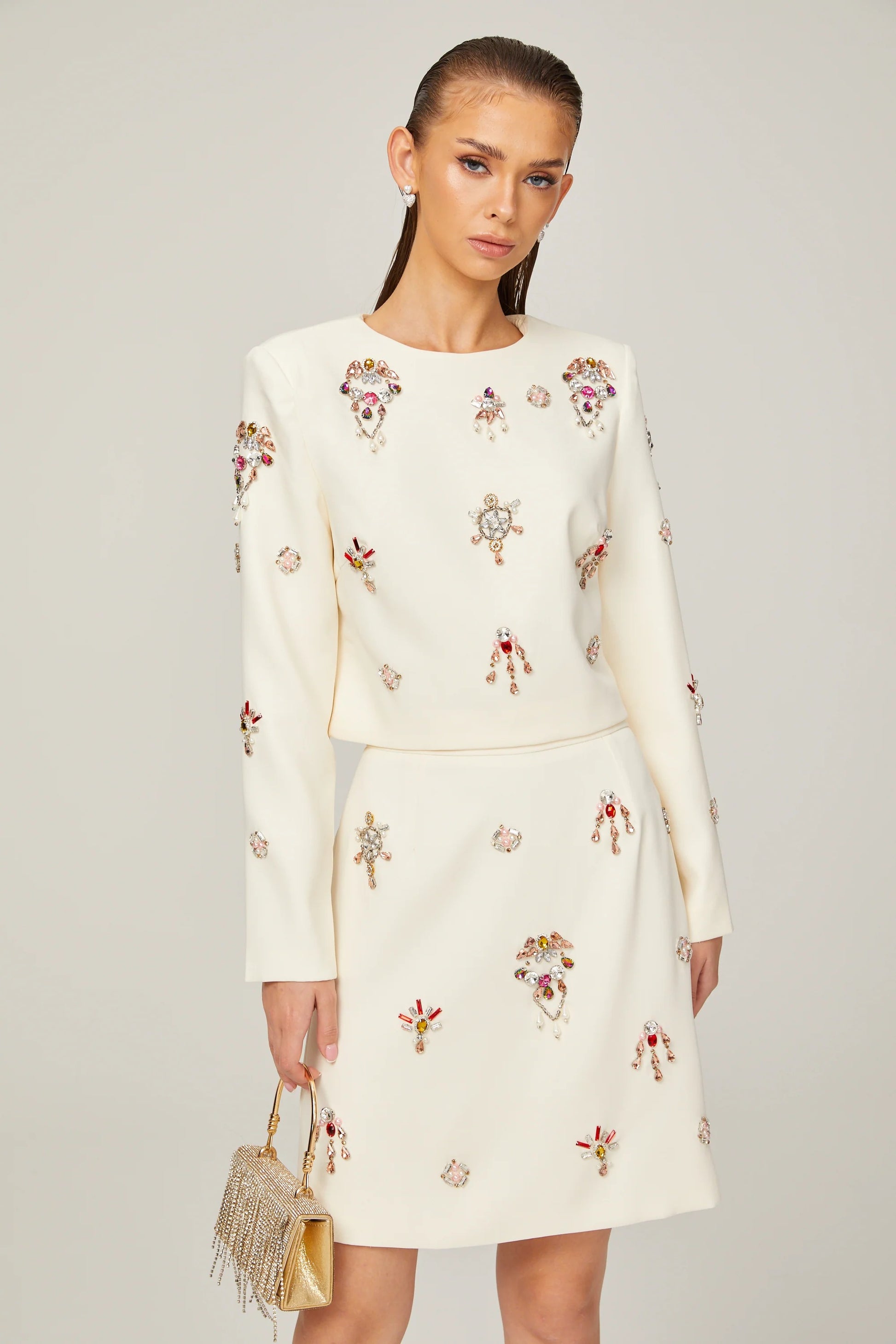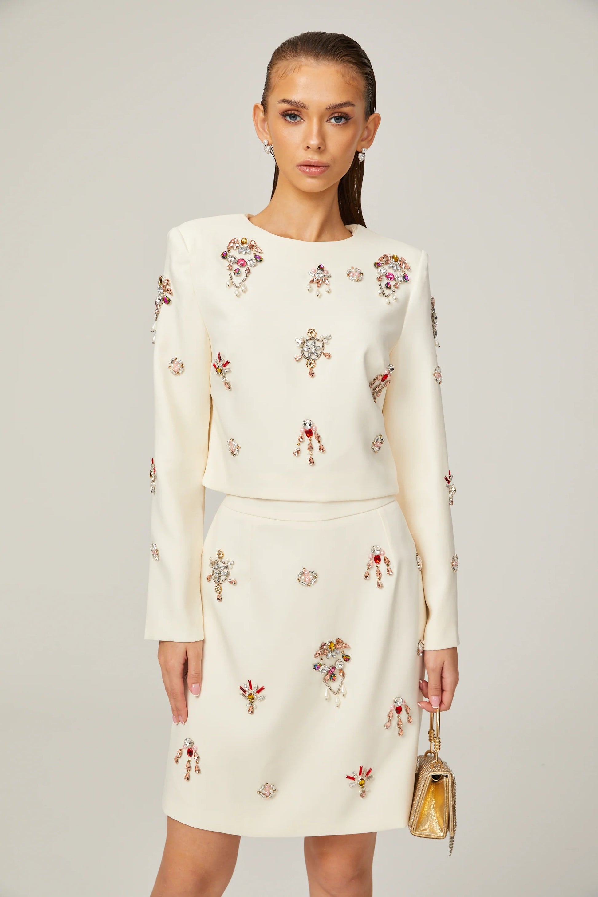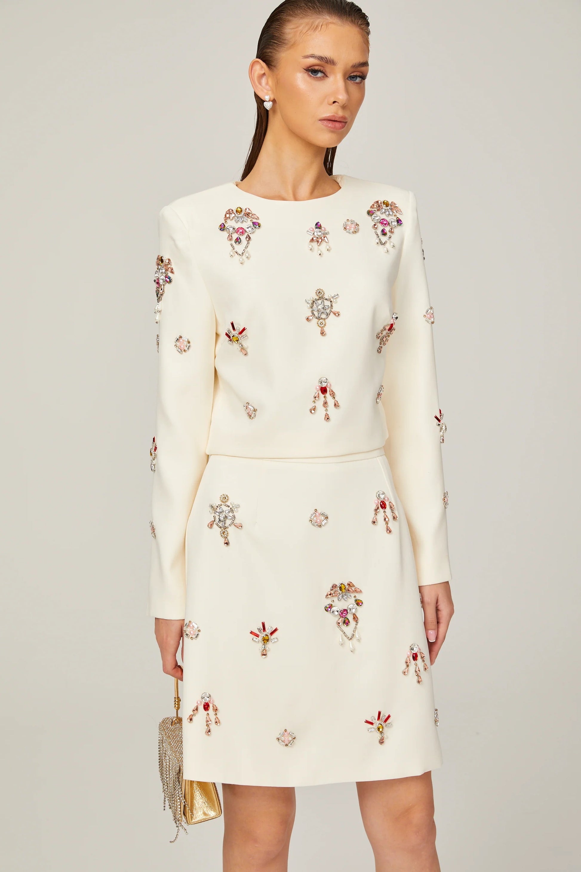 Jeanne white crystal-embellished top & skirt matching set