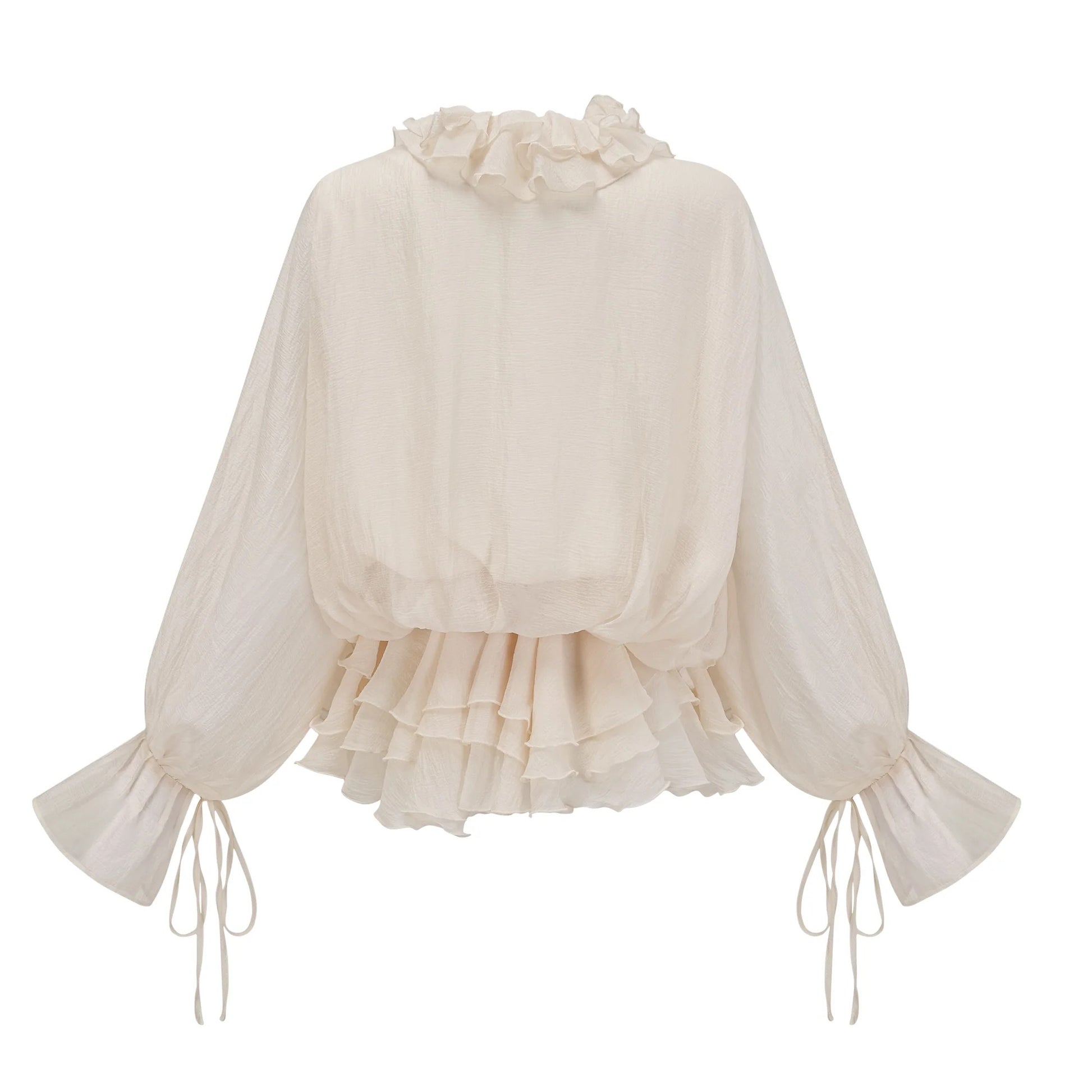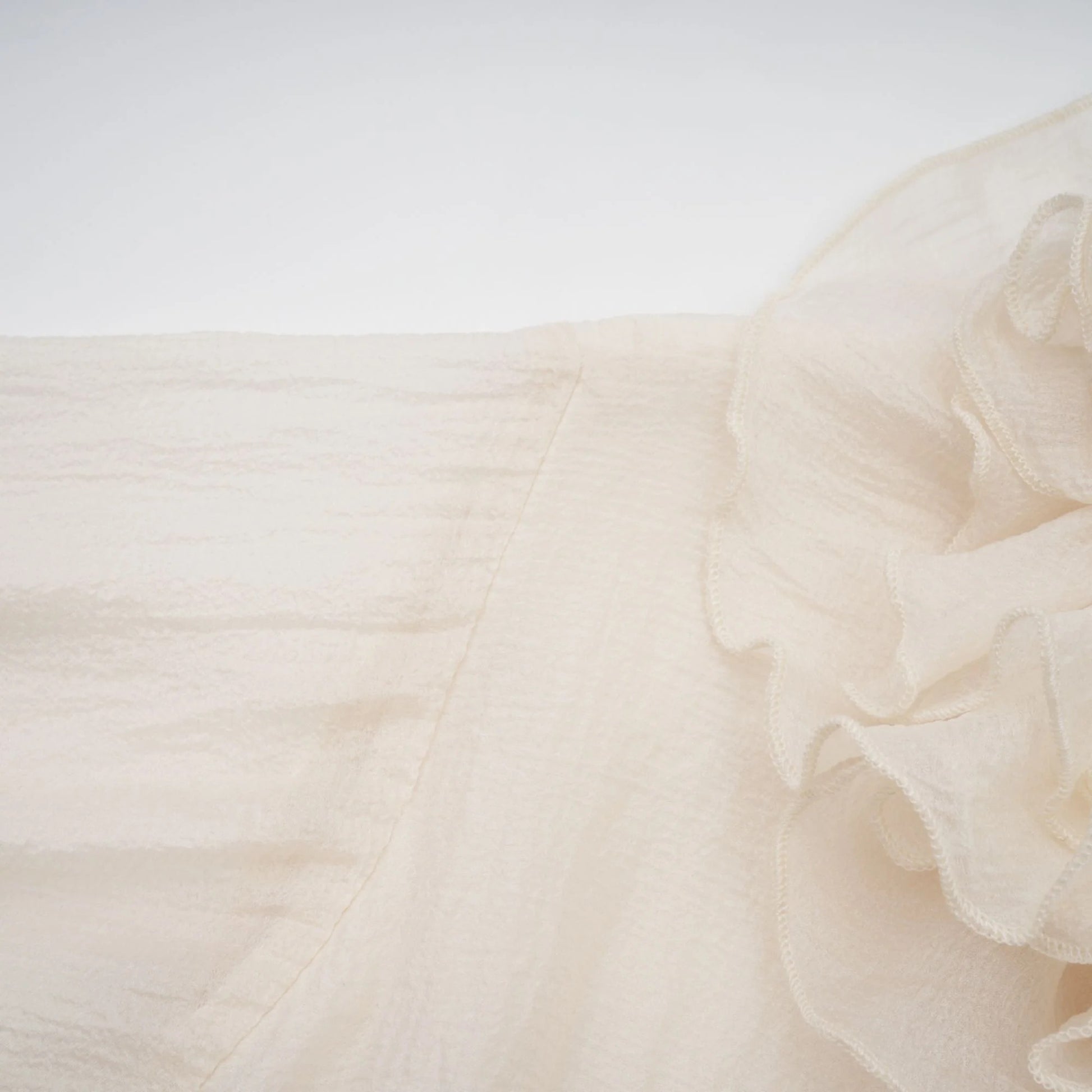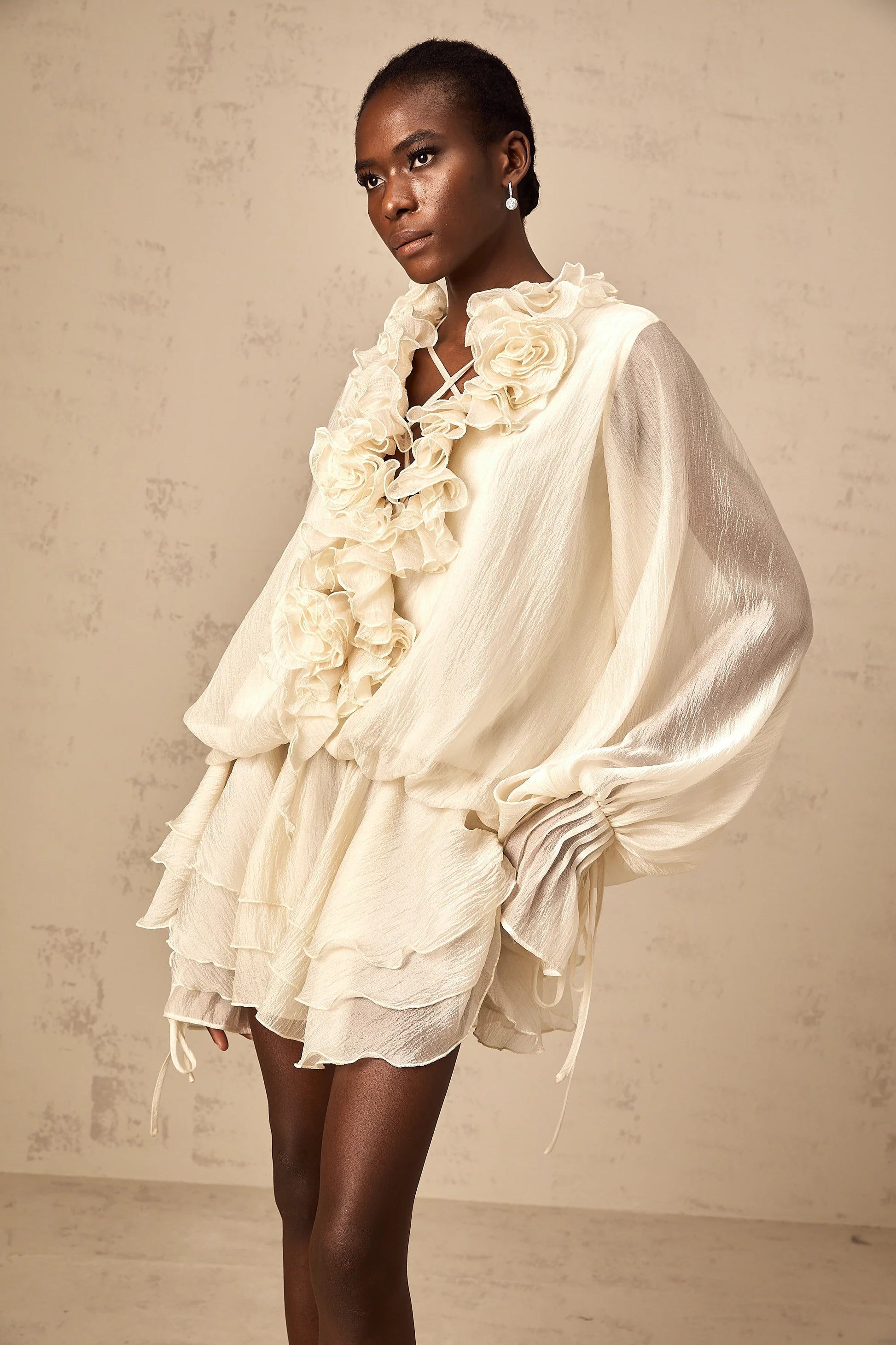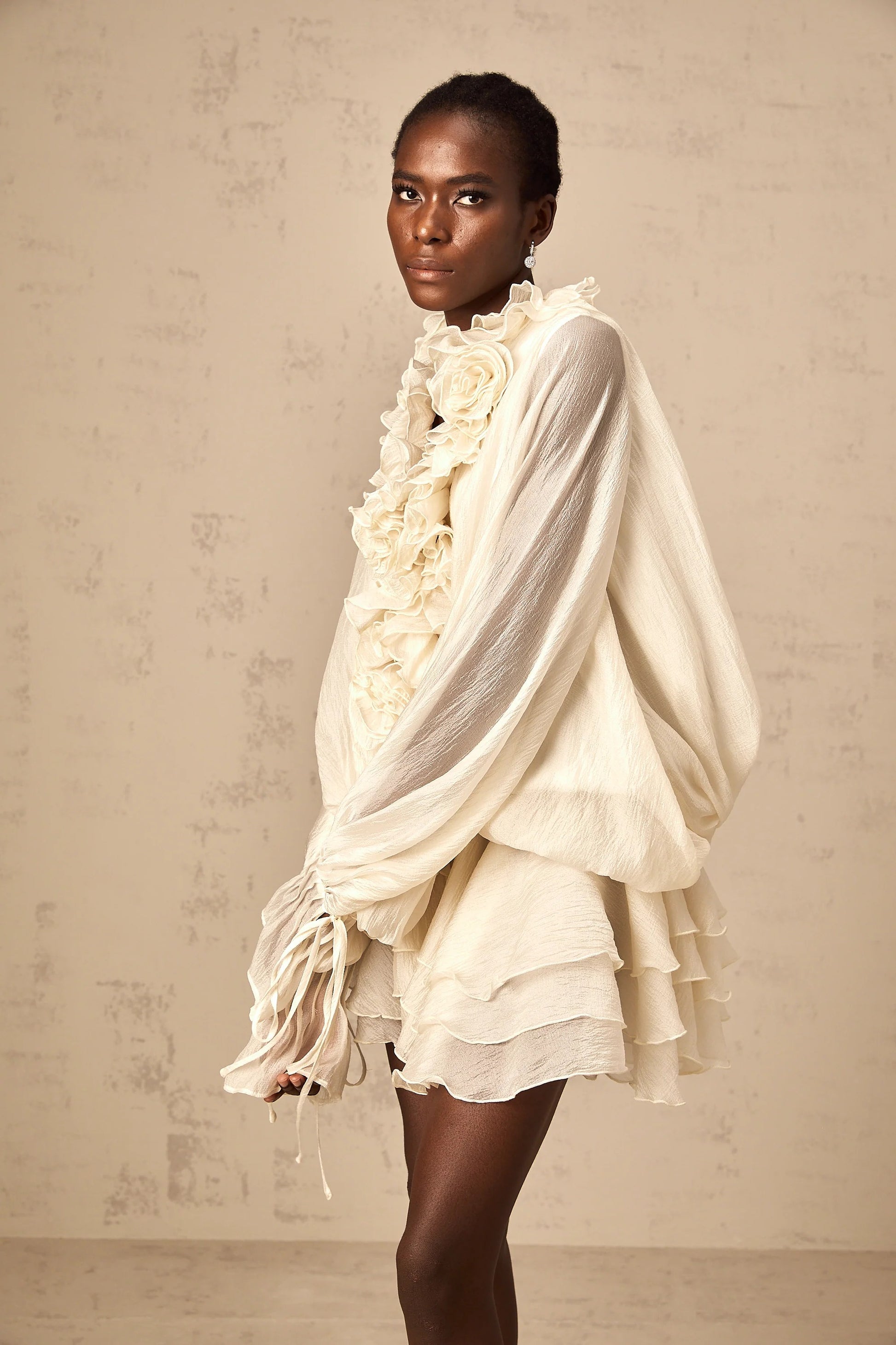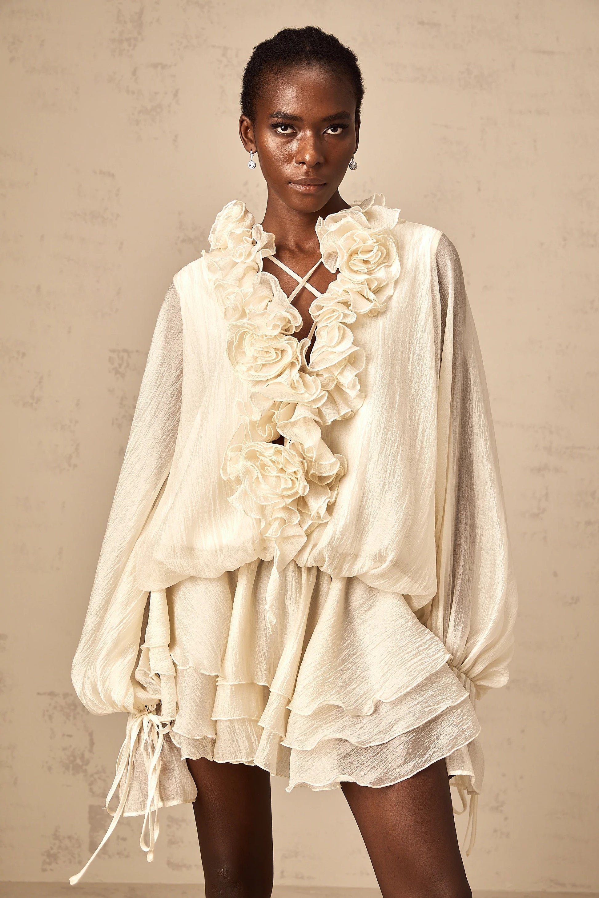 Zephyrine Floral-Applique Tiered Mini Dress in Neutrals